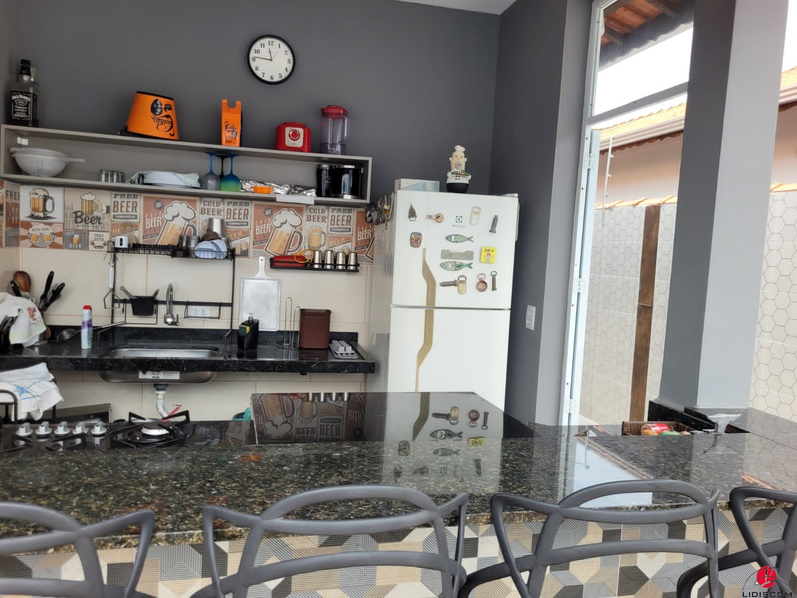 churrasqueira a gás e balcão em granito. Conta com 02 vagas de garagem, portão