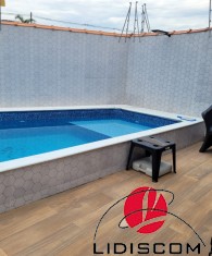 Lazer privativo com piscina em deck de porcelanato e espaço gourmet moderno com