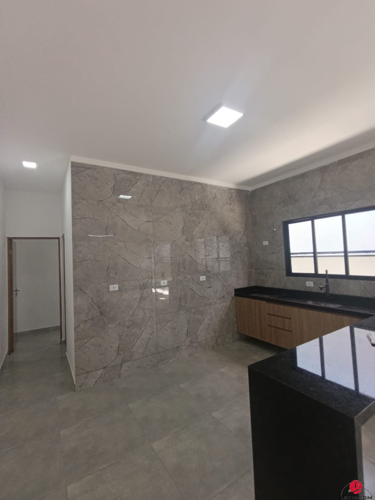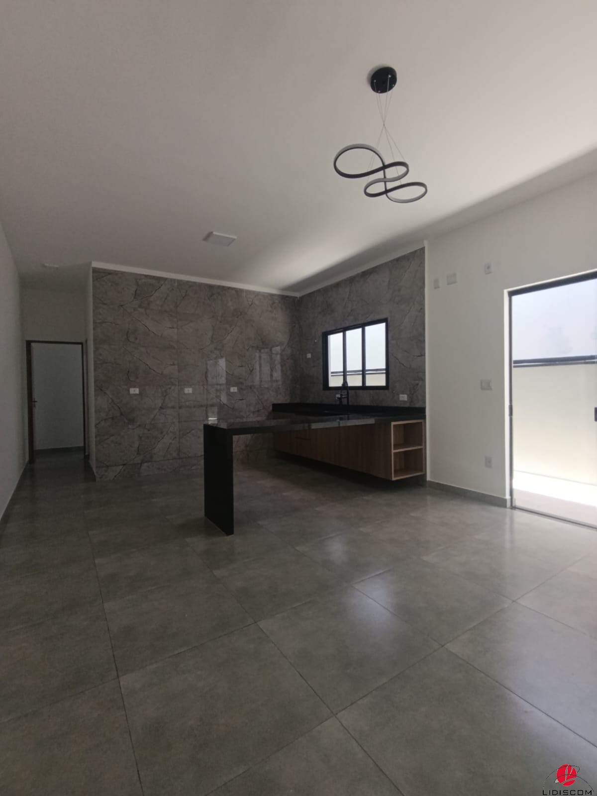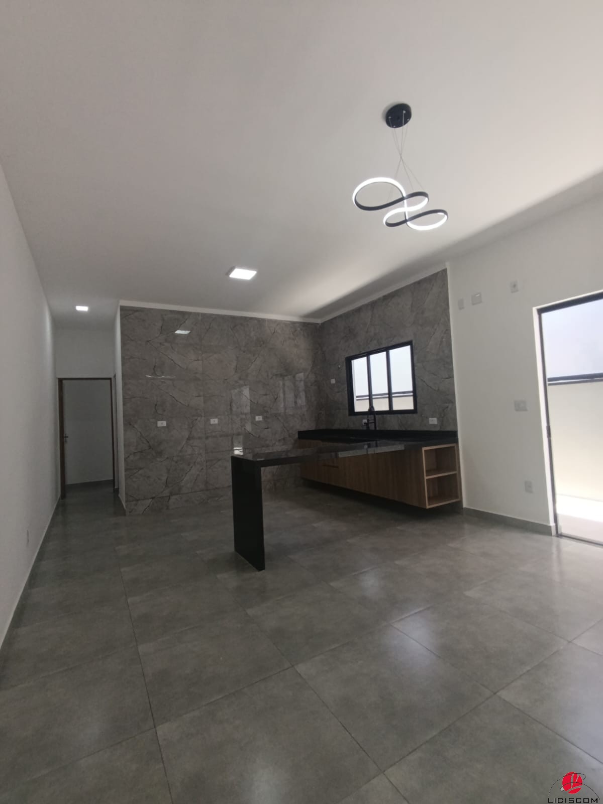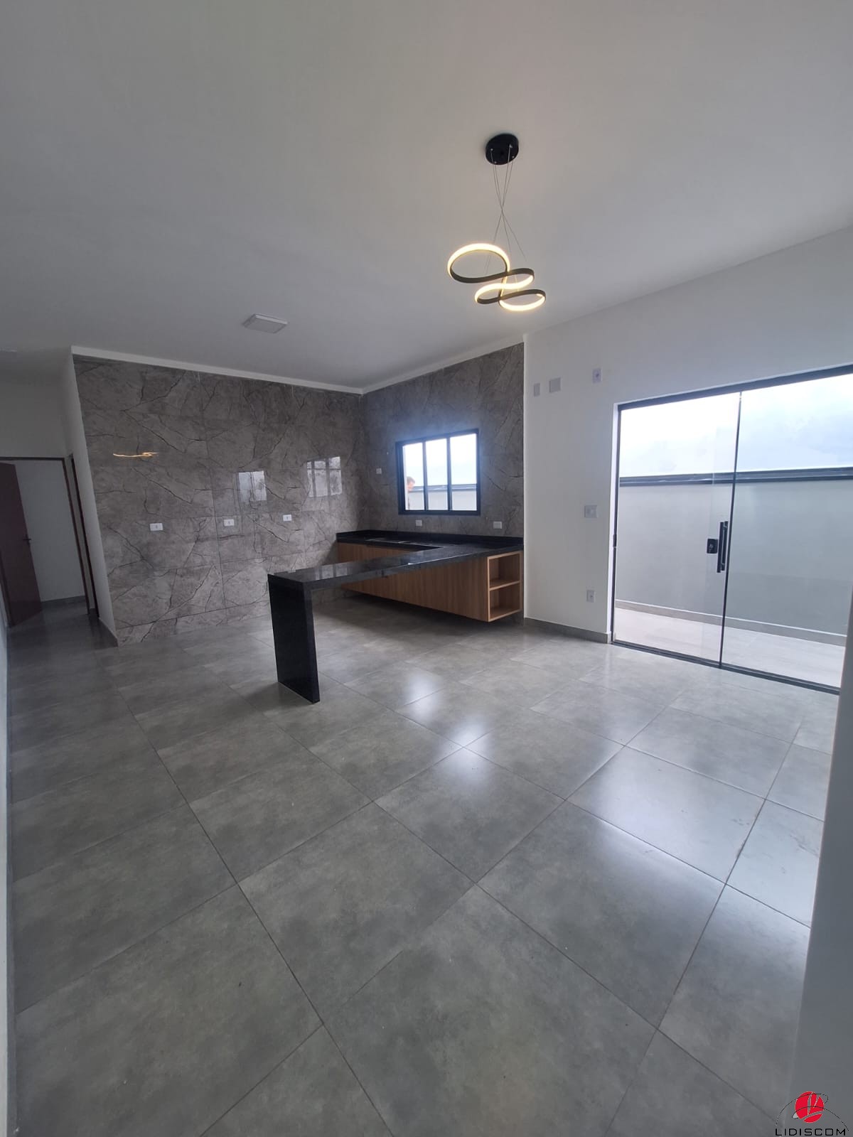 social e sala integrada à cozinha com gabinetes.