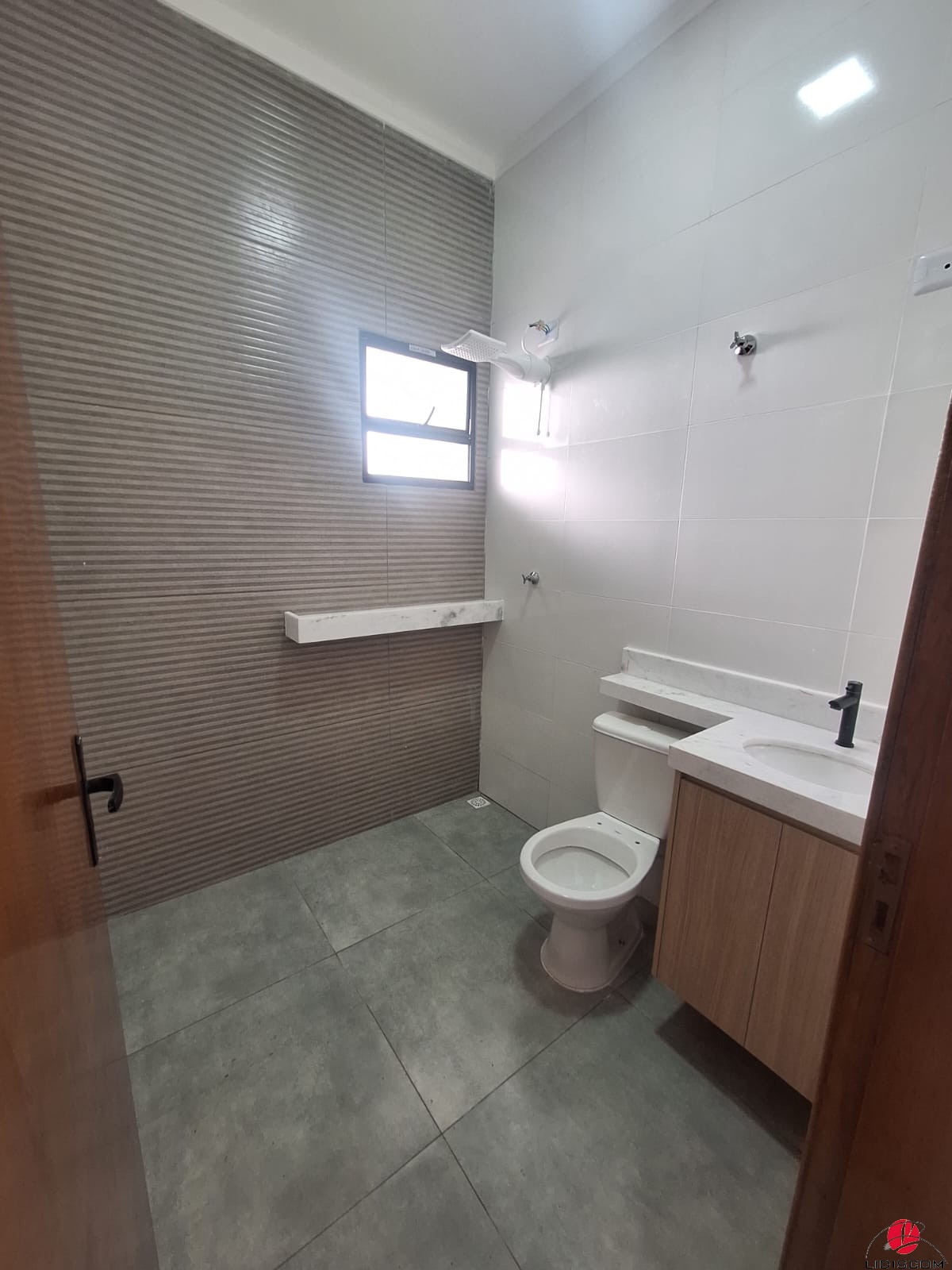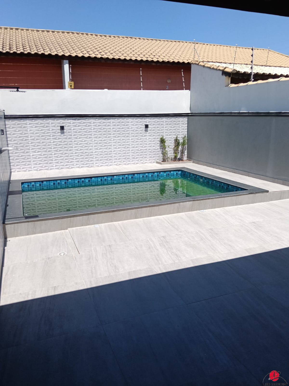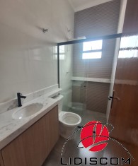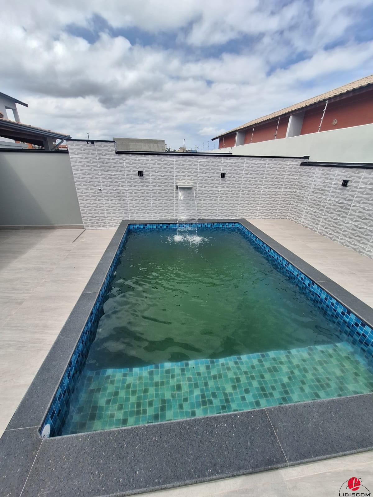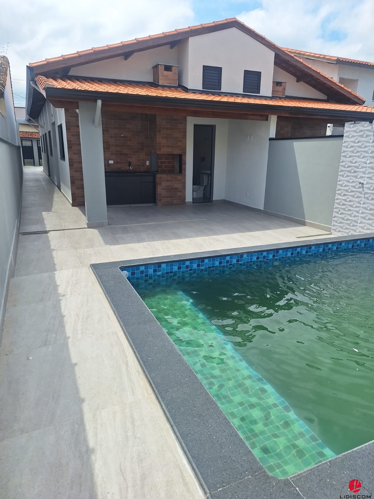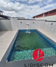 com churrasqueira revestida, pia em granito, 02 duchas tira-areia e 01 lavabo