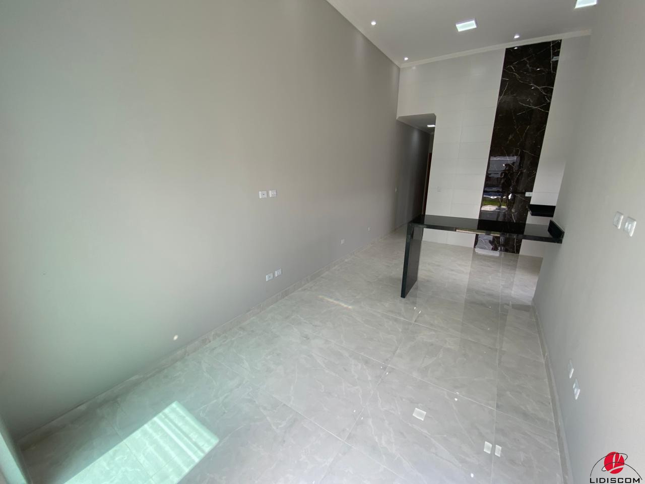quartos, sala e cozinha em conceito aberto, pé direito alto, balcão em granito
