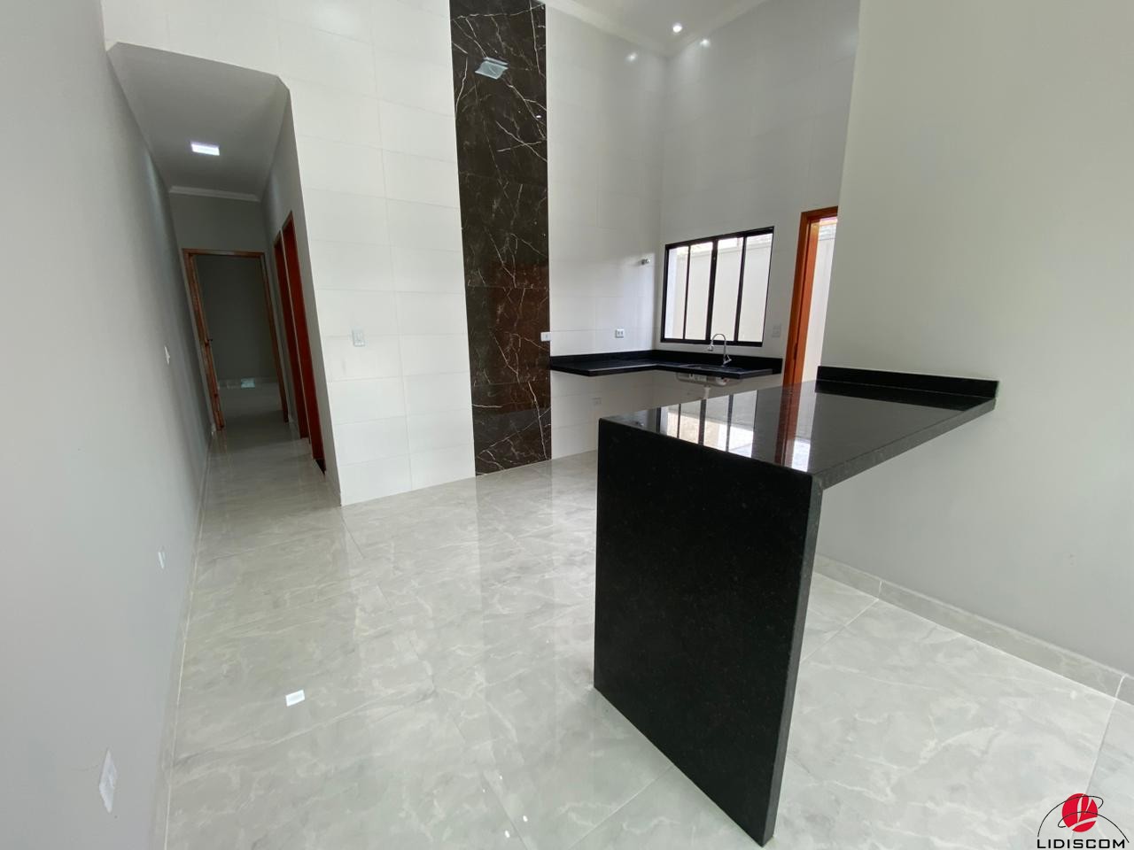 quartos, sala e cozinha em conceito aberto, pé direito alto, balcão em granito