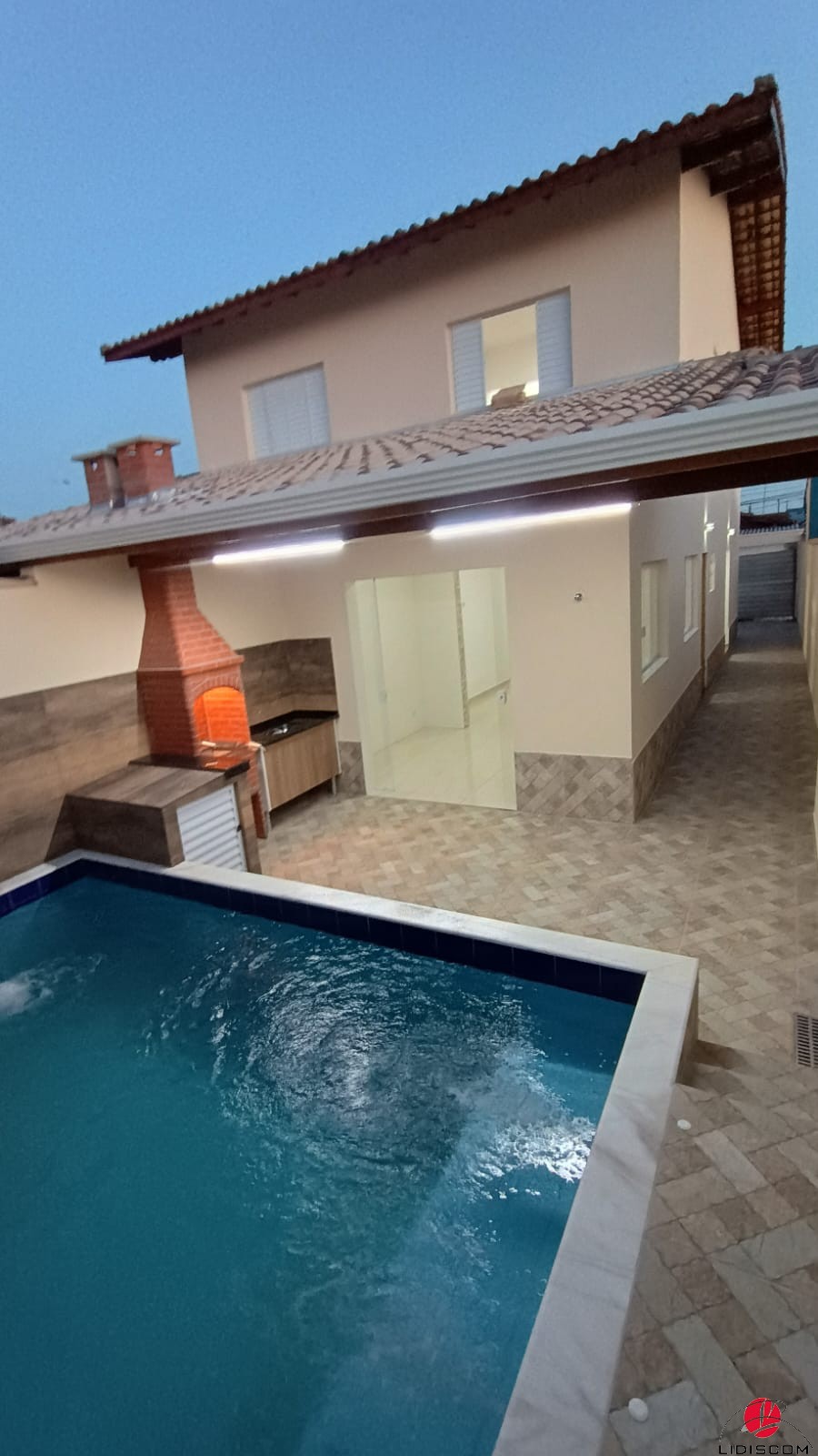 Sobrado com 03 dormitórios, 01 no piso térreo e 02 no piso superior, sendo um deles suíte, 01 banheiros social, mais uma lavabo, lavanderia coberta, Sala e cozinha em conceito aberto, Lavanderia coberta, uma linda área gourmet com churrasqueira e uma belíssima piscina com 02 bicos de hidromassagem e cascata, garagem para 02 autos. Acabamento de primeirissimaqualidade4, pisos em porcelanato, esquadrias em alumínio, Fica a 600 metros do mar. LADO PISTA —Imóvel muito bem localizado em bairro demoradores.